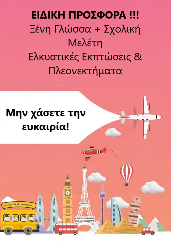Για όλους τους μαθητές που θέλουν να συνδυάσουν Ξένη Γλώσσα και Σχολική Μελέτη / Ενισχυτική Διδασκαλία στο ίδιο πρόγραμμα, έχουμε ετοιμάσει μια πολύ συμφέρουσα πρόταση!